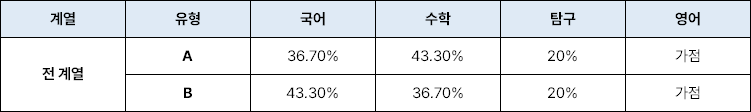 키포인트: A/B 두 방식 중 유리한 방식 자동 반영. 국·수의 가중치가 높고 탐구 20% 고정.