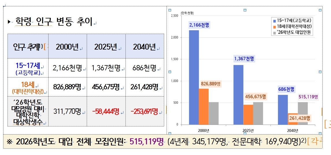 대학 진학 대상인 18세 이상 인구는 2000년 82만6천889명에서 2025년 45만6천675명으로 줄었고 2040년에는 26만1천428명으로 감소할 것으로 예상됐다.