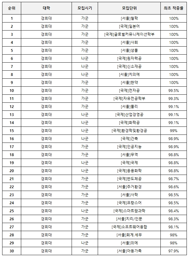 다음 표에서는 2025학년도 정시에서 최초 적중률이 가장 높았던 경희대의 TOP30 학과를 살펴보고자 한다.