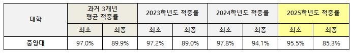 중앙대는 최근 3년 동안 정시 최초합 기준 적중률이 평균 97% 내외로 매우 높게 유지되고 있지만, 추가합격까지 포함한 최종 적중률은 연도별로 차이가 커지는 경향을 보였다.