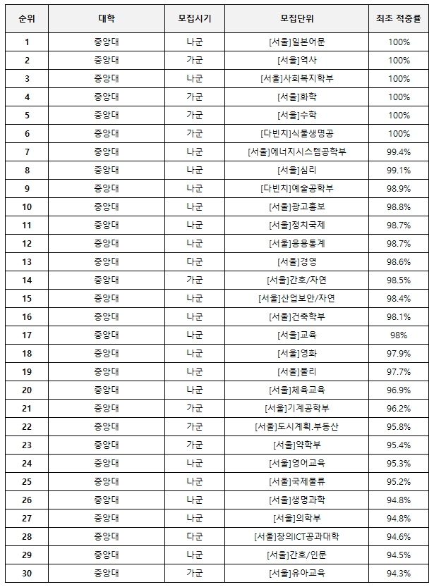 다음 표에서는 2025학년도 정시에서 최초 적중률이 가장 높았던 중앙대의 TOP30 학과를 살펴보고자 한다.