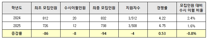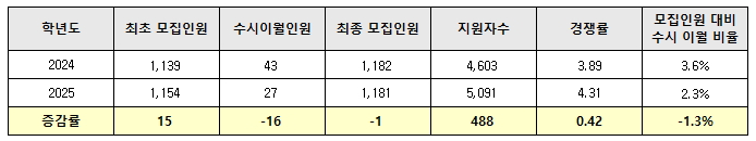 이화여대의 2025학년도 정시 모집인원은 전년 대비 15명 증가했으며, 수시 이월인원은 16명이 줄었다. 그 결과 전체 모집인원 대비 수시 이월 비율은 3.6%에서 2.3%로 1.3% 하락하였다. 반면 전체 모집단위 지원자수는 전년도보다 488명이 증가하였다.