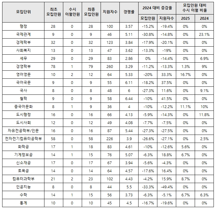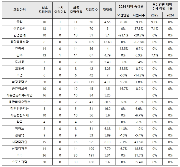 아래 표에서는 2025학년도 모집단위별 모집인원과 수시 이월인원의 세부현황을 정리하였다.