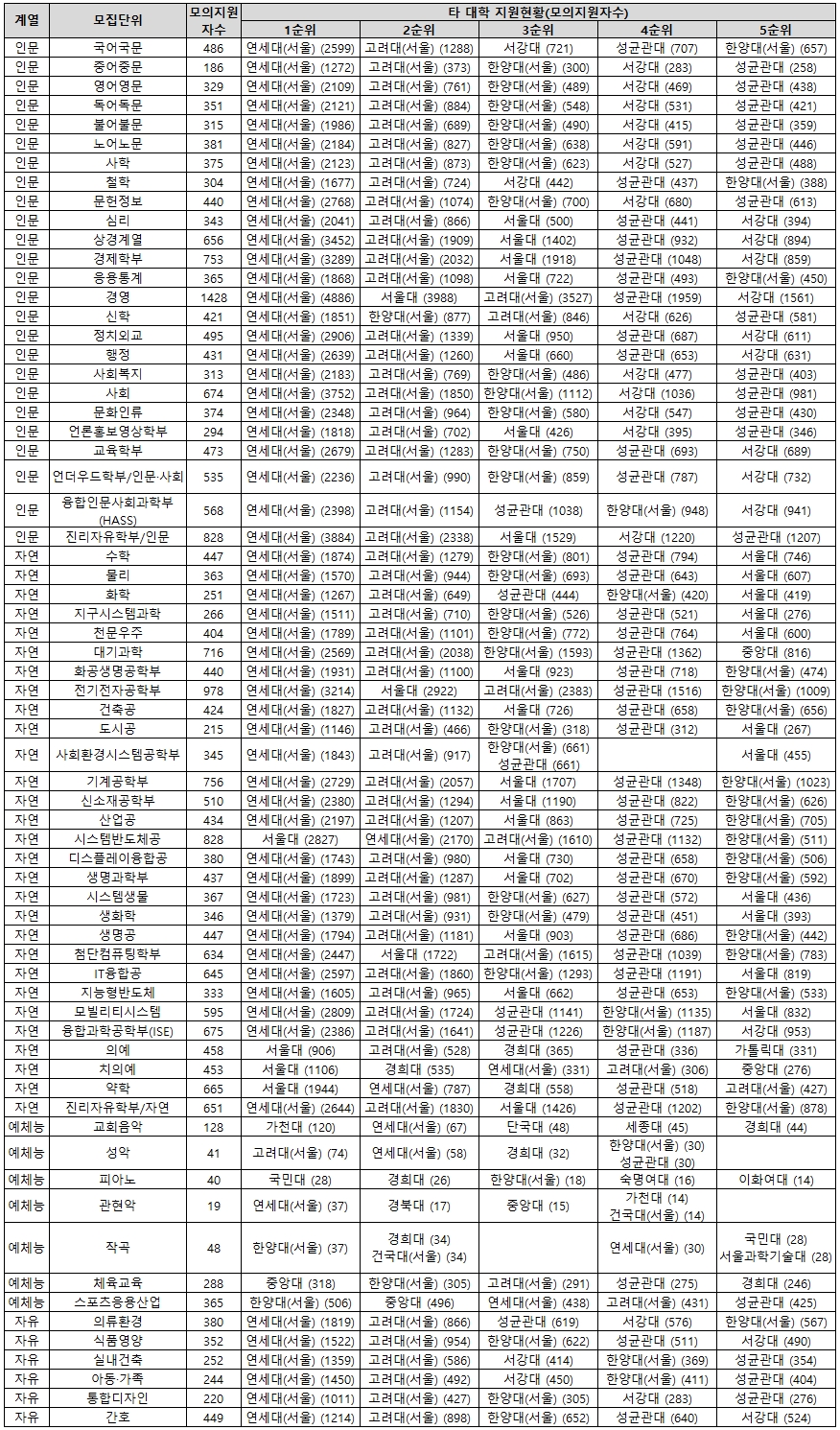 고려대는 인문계에서 연세대와의 상호 교차 지원 비중이 매우 높게 나타났고, 자연계는 성균관대 지원 비중이 연세대보다 근소한 차이로 높게 나타났습니다. 서울대는 일관되게 상위 순위에 위치하나, 연세대 대비 서울대 집중도는 다소 완만한 편입니다.