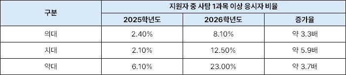 진학사가 2026학년도 정시를 앞두고 의대·치대·약대 모의지원 데이터를 분석한 결과,탐구 응시영역을 지정하지 않은 대학의 지원자 중 사탐 응시자 비율은 의대 8.1%,치대 12.5%,약대 23.0%로 나타났다.이는 전년도 비율인 의대 2.4%,치대 2.1%,약대 6.1%와 비교해 큰 폭으로 증가한 수치로,실제 정시 지원에서도 유사한 흐름이 나타날 가능성을 시사한다.