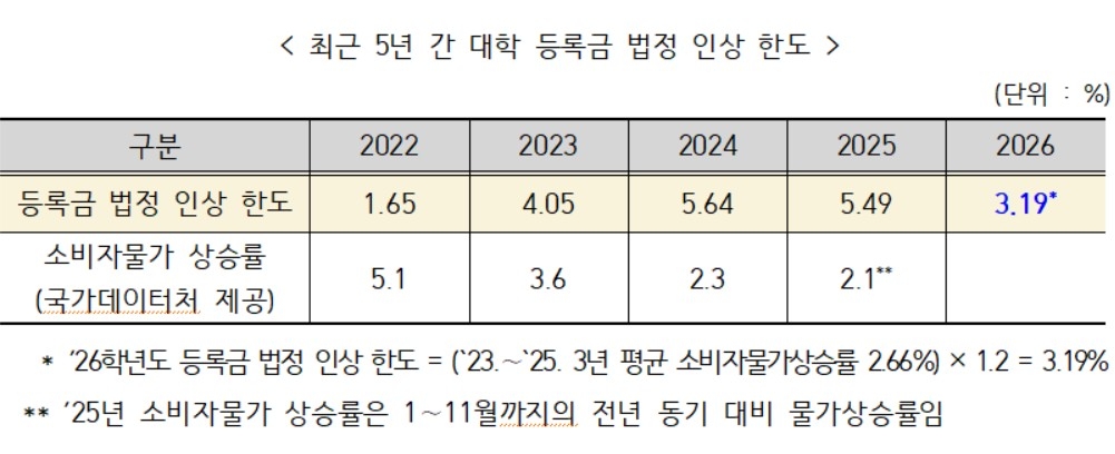 내년 등록금 인상 한도는 올해(2025학년도) 인상 한도였던 5.49%와 비교해 2.3%포인트(p)나 낮아졌다.