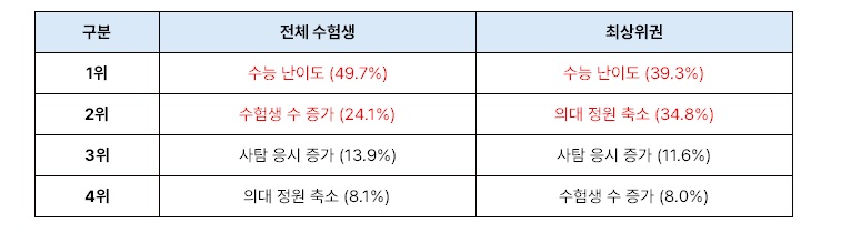 - 최상위권, ‘불수능’(39.3%) vs ‘의대 정원 축소’(34.8%) 팽팽