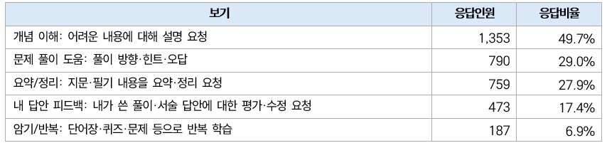 이는 학생들이 AI를 단순히 정답을 찾는 도구가 아니라, 막히는 개념을 설명받거나 풀이 방향을 확인하는 ‘질문형 학습 도구’로 활용하고 있음을 보여주는 결과다.