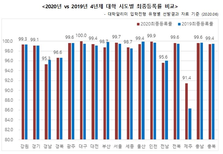 반면, 고3 학생 수가 감소했음에도 등록률이 상승한 지역은 제주 5.1% 증가로 가장 높은 등록률 증가세를 보였고, 대구 0.5%, 대전 0.3%, 서울, 세종, 인천 지역이 0.2%, 전북 0.1% 상승했다. 강원, 경기, 경북, 광주 지역의 대학 등록률은 2019학년도와 동일했다.