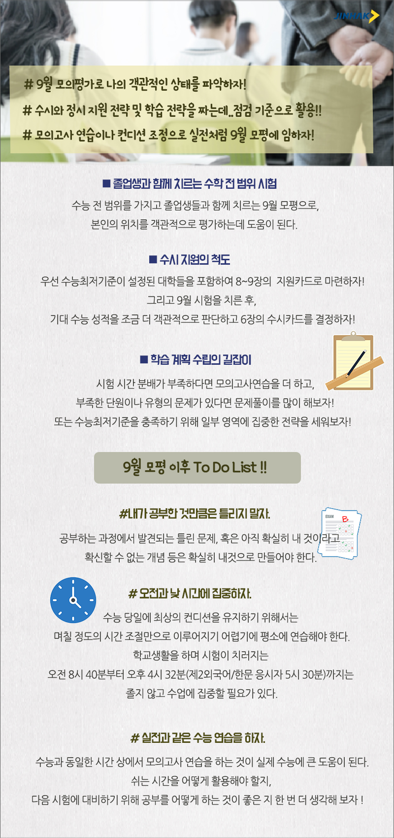 진학사 입시전략연구소 우연철 소장은 “9월 모의평가를 통해 나의 현 상태를 파악하는 것은 수시와 정시 지원 전략 및 학습 전략을 짜는데 있어 필수적이다. 단, 9월 모평에 최선을 다하지 않은 상태로는 이를 객관적으로 판단하기 어려워진다. 따라서 9월 모평 전에도 수능과 같이 모의고사 연습을 하거나 수면 시간을 조정해보며 최고의 컨디션으로 모평에 임할 필요가 있다.”고 말했다.