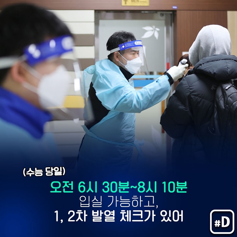무엇보다 코로나19 확산을 막기 위해 수능 당일 1, 2차 발열 체크를 한 뒤 이상이 없어야 수험장 입실이 가능하다는 점을 명심해야 하는데요. 시험장에 오전 6시 30분부터 출입이 가능한데 8시 10분까지는 반드시 입실해야 합니다.