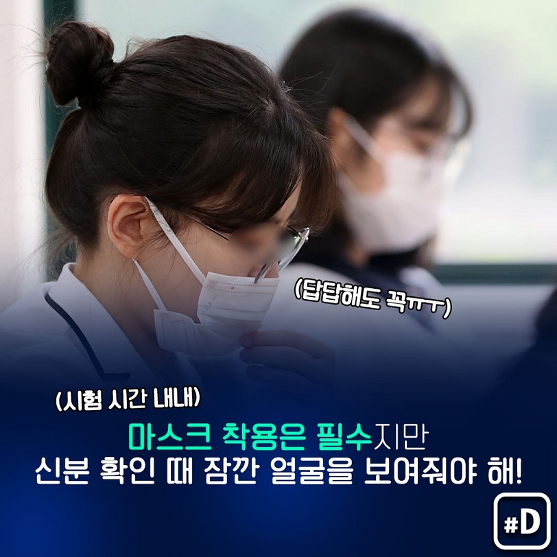 수험장에서 마스크 착용은 필수입니다. 다만 신분 확인을 위해 잠깐 마스크를 내리고 얼굴을 보여줘야 합니다.