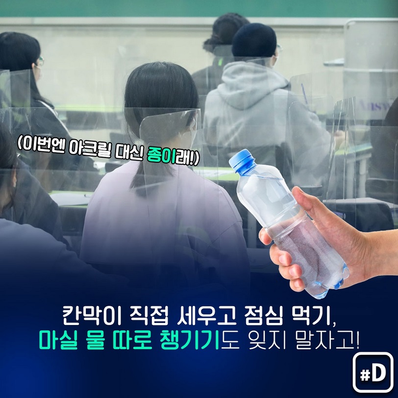 점심은 자신의 자리에서 종이 칸막이를 직접 세우고 먹어야 하고 정수기 이용을 할 수 없기 때문에 물은 따로 챙겨야 합니다.