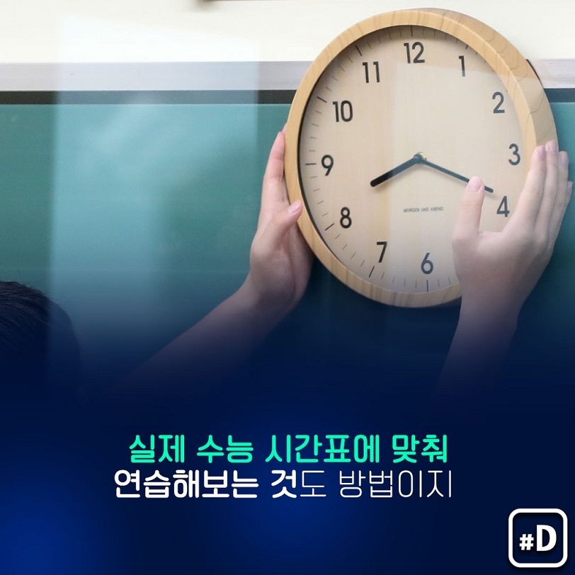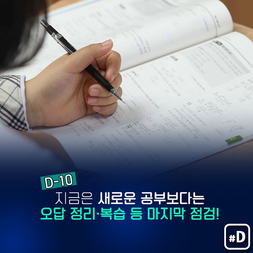 공부 방법과 관련해선 불안한 마음에 새로운 공부를 찾아서 하기보다는 긍정적인 자세로 오답 정리와 복습 중심의 마지막 점검을 하는 것이 좋다고 합니다. 실제 시험에 대비해 시간 안배, 문제 푸는 순서 정하기, 모르는 문제 넘기기, 가채점표 작성, 마킹 연습 등도 해두면 좋습니다.