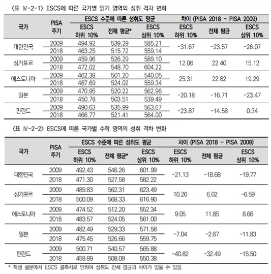 연구진은 부모의 직업과 가정 보유자산, 부모 교육수준 등 변수를 합산한 경제사회문화적지위지수(ESCS)에 따른 학생들의 영역별 평균 성취도를 산출하고, 2009∼2018년 평가에서 어떻게 달라졌는지 분석했다.