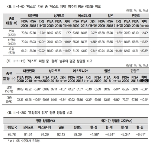 아울러 연구진이 각 영역의 평가요소별 정답률을 분석한 결과, 우리나라 학생들의 기초적인 읽기 능력이나 복합적 텍스트를 분석하는 능력이 비교적 떨어지는 것으로 나타났다.